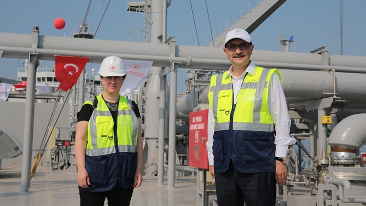 Güç Bakanı Dönmez, Ertuğrul Gazi gemisinin devreye alınmasına yönelik merasimin yapıldığı Hatay’da bir küme basın mensubu ile sohbet toplantısı düzenledi. Dönmez, Ertuğrul Gazi gemisine 28 Haziran’da birinci LNG kargosunun yanaştırılacağını ve operasyona başlayacaklarını belirterek, 29 Haziran’da da LNG transferinin yapılacağını kaydetti. Bu gemilerin, doğalgaz depolama ve gazlaştırma gemisi olduğunu anlatan Dönmez, “Üzerinde gazlaştırma ünitesi yardımıyla direkt tanklarındaki sıvı doğalgazı gazlaştırıyor ve deniz altındaki borular yardımıyla da karaya, oradan da ulusal iletim şebekemize bağlanıyor. Tam kapasite çalıştığında, 7 milyar metreküp doğalgazı sisteme basma kapasitesine sahip bir gemiden bahsediyoruz. Bu da Türkiye muhtaçlığının yüzde 10’undan fazlasına denk geliyor. Türkiye’de 50 milyar metreküp ortalama doğalgaz tüketimimiz olduğu varsayılırsa, yüzde 10’undan fazlasını teknik olarak buradan sağlayabiliyoruz” halinde konuştu.