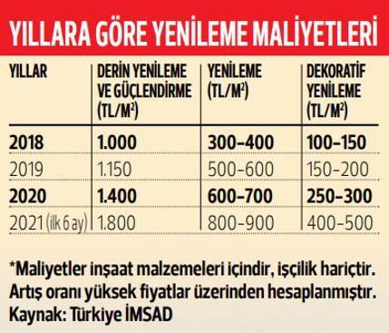 Küçükoğlu tadilatlar için personellik hariç maliyetler konusunda şu bilgileri verdi: “Eğer kolonlara kadar inilip güçlendirme dahil derin yenileme yapılıyorsa yaklaşık maliyet metrekare başına 1.800 TL. 100 metrekare mesken için 180 bin TL ödenecek. Şayet güçlendirme yapılmadan tesisat (elektrik, su vb.), ısıtma-soğutma, havalandırma sistemleri, yalıtım dahil cephe sistemleri, pencere-cam ve çatı-baca sistemleri ile ilgili bir yenileme kelam konusu ise metrekare başı maliyet 800-900 TL’ye düşüyor. 2021 yılı birinci 6 ay datalarına nazaran boya, parke, kapı, pencere, seramik ve vitrifiye yenilemelerini kapsayan dekoratif yenileme ise metrekare başına 400-500 TL maliyetle yapılabiliyor.”