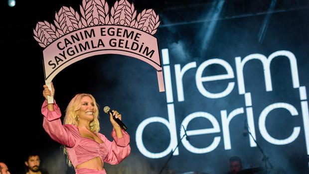Ünlü popçu, yaklaşık 30 bin kişinin izlediği konsere bir sürprizle başladı. Derici, yıllar evvel Türk sanat müziğinin efsane ismi Zeki Müren’in yaptığı üzere, üzerinde “Canım Egeme saygımla geldim” yazılı taç biçimindeki dövizle sahneye çıktı.