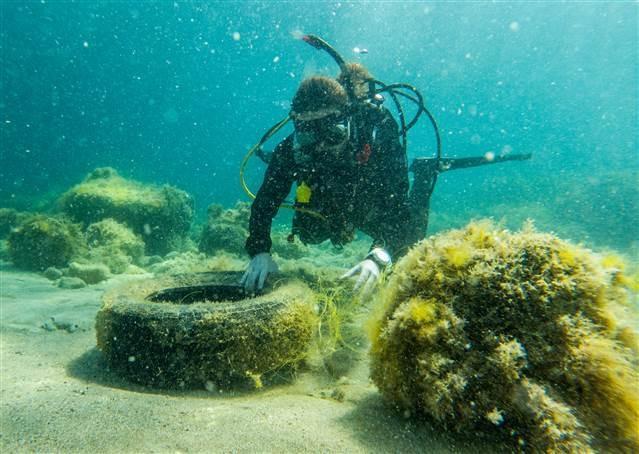 Bir araba lastiğinin de bulunduğu çok sayıda yabancı unsur, karaya çıkarıldı.