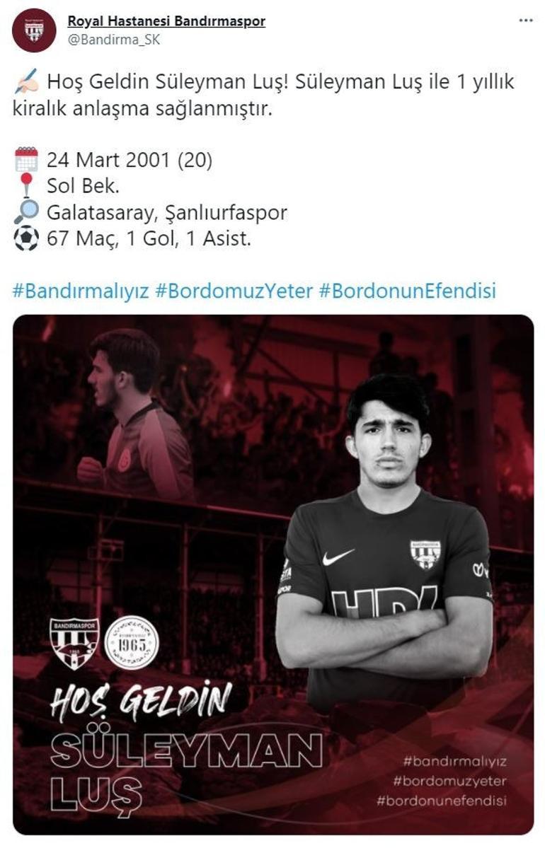Kulübün toplumsal medya hesabından yapılan açıklamada, sol bek mevkisinde oynayan 20 yaşındaki oyuncuyla 1 yıllık kiralık olarak mutabakat sağlandığı duyuruldu.